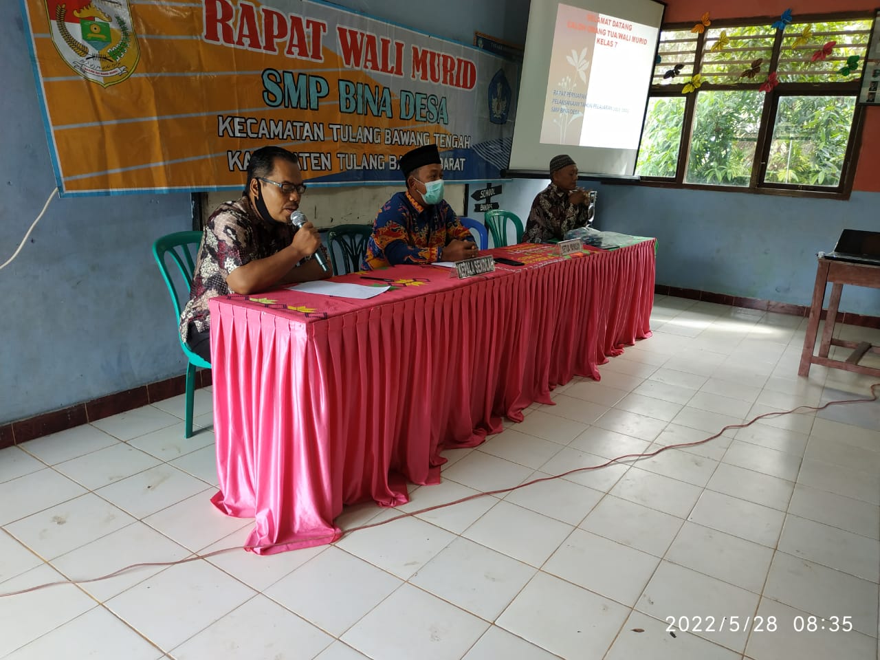 Untuk mengubah persepsi tersebut maka hari ini Sabtu, 28 Mei 2022, SMP Bina Desa Tulang Bawang Tengah mengundang Wali Murid Siswa Baru Tahun Ajaran 2022/2023. Dari 91 Undangan yang disampaikan kepada Wali Murid siswa baru tercatat 76 Orang Tua yang bisa menghadiri rapat pada hari ini. Adapun Materi yang disampaikan diantaranya 1).Pemaparan Selayang Pandang Sekolah, 2) Visi Misi Sekolah, 3). Kegiatan kurikuler dan Ekstra Kurikuler, 3). Kurikulum, 5). Tata tertib sekolah.